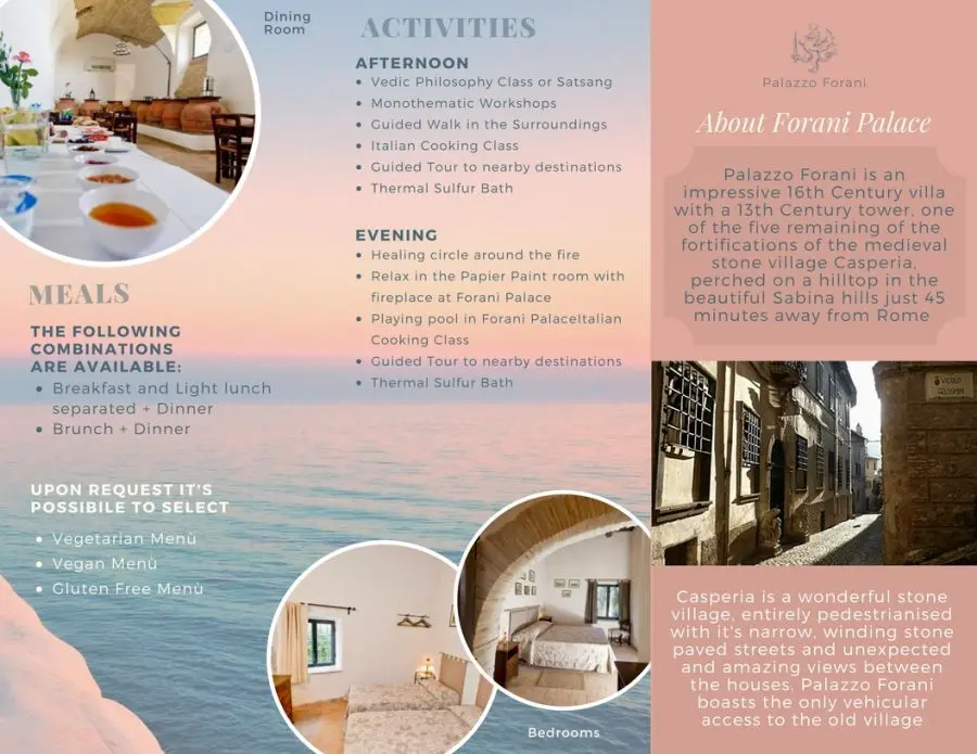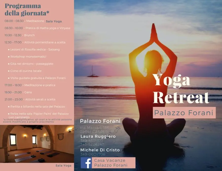 A tutti i praticanti del retreat, su richiesta, sarà inoltre offerta una visita guidata a Palazzo Forani e sconti sulle altre attività proposte da Forani ArtEventi.